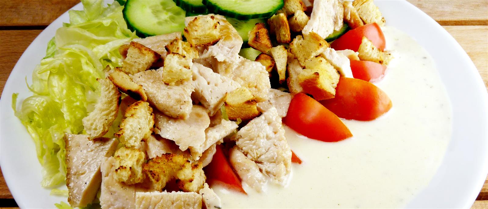 Friss jégsaláta, uborka, paradicsom, vaslapon sütött csirkemell és kruton.