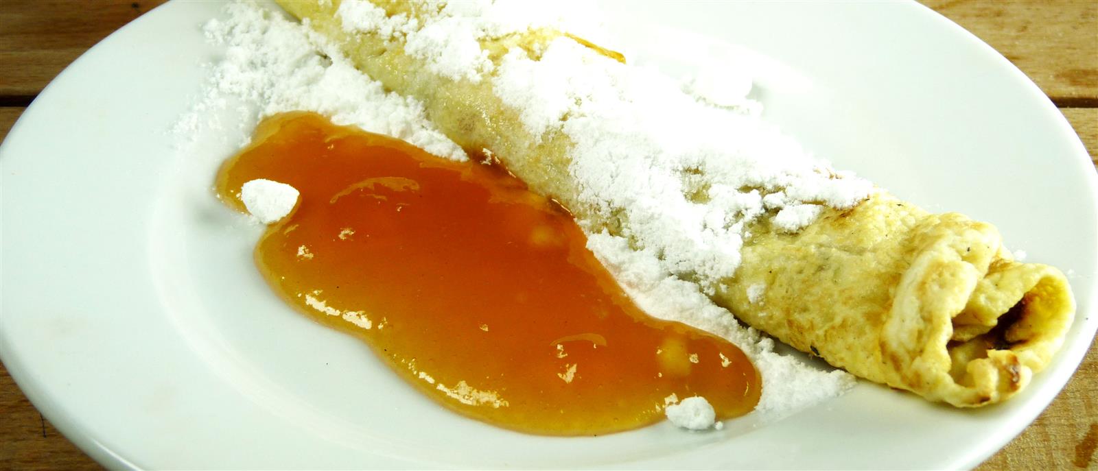 Sárgabarack ízzel töltött palacsinta. Glutént tartalmaz. Tojást tartalmaz. Hozzáadott cukrot tartalmaz.